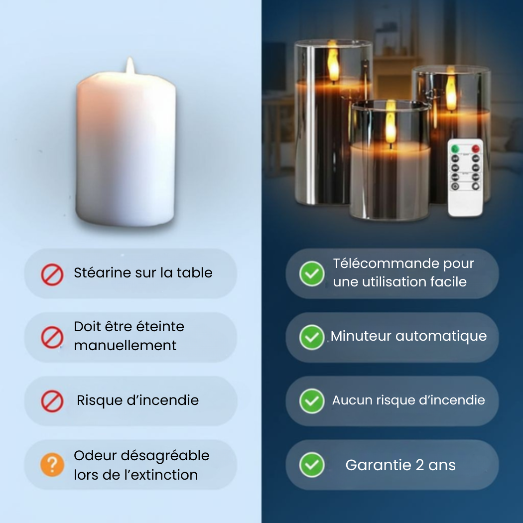 Les bougies peuvent s’allumer et s’éteindre automatiquement pour créer l’ambiance parfaite chez toi, exactement au moment où tu le souhaites.
