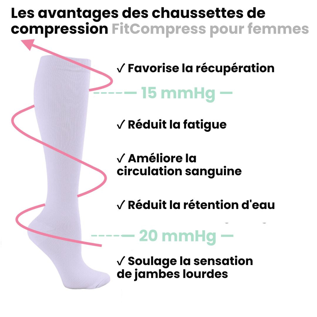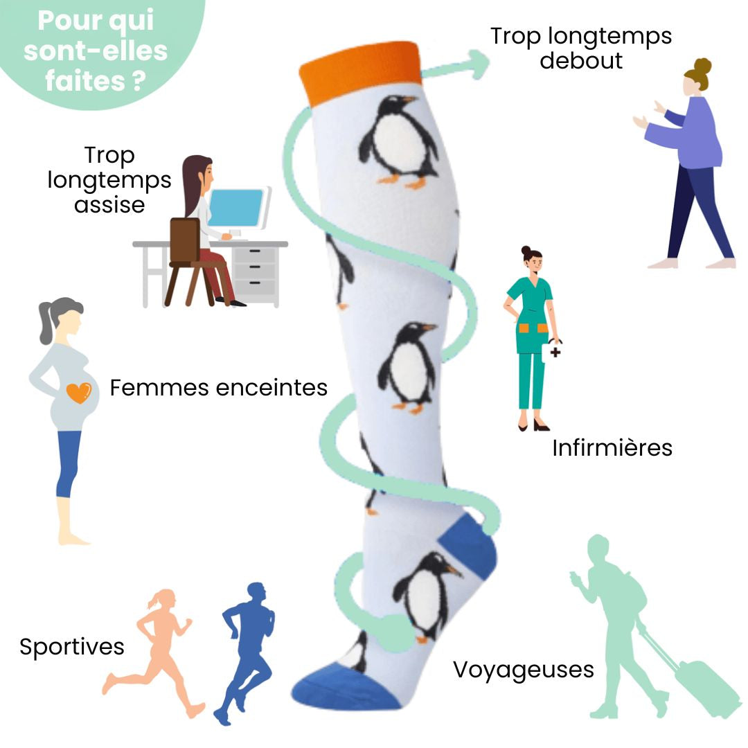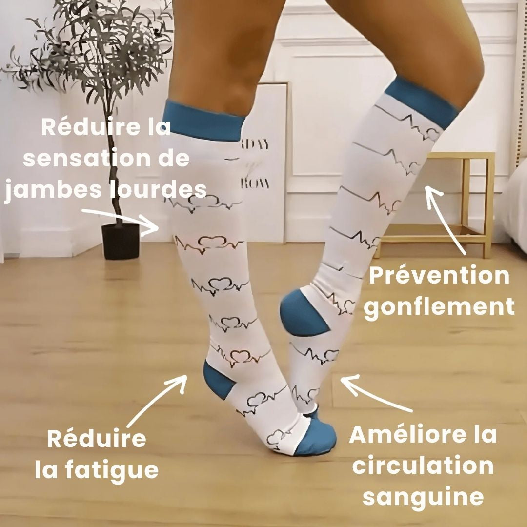 Les chaussettes avec une pression de compression de 15 à 20 mmHg sont recommandées par les médecins et utilisées par les sportives de haut niveau.